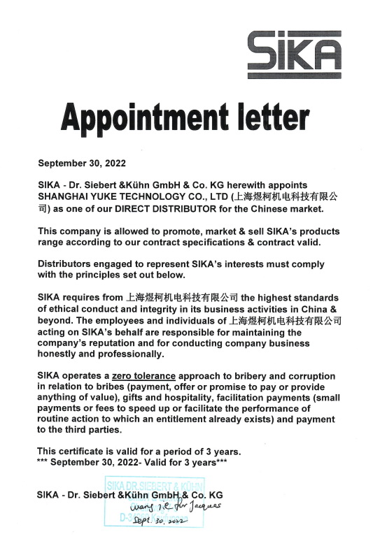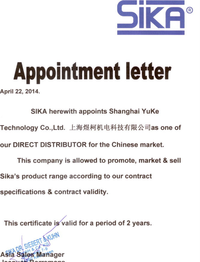 德國(guó)Sika儀表一級(jí)代理商授權(quán)證書(shū)