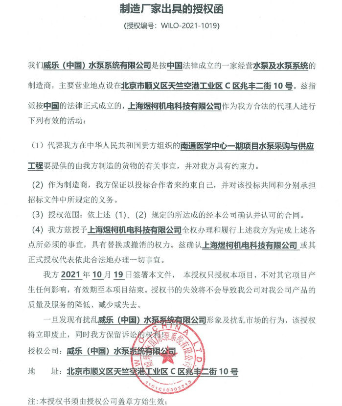 德國威樂Wilo水泵(中國)授權上海煜柯機電科技有限公司作為代表參加南通醫學中心項目的貨物銷售的相關事宜。