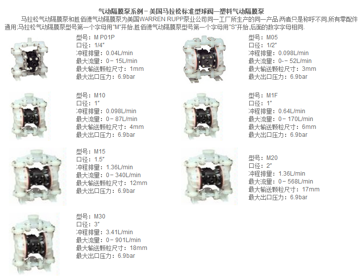 美國MARATHON馬拉松氣動隔膜泵,和SANDPIPER勝佰德氣動隔膜泵為美國WARREN RUPP泵業公司同一工廠所生產的同一產品.兩者只是稱呼不同和外表油漆顏色不同的區別.所有零配件通用.SANDPIPER勝佰德型號第一個字母用S開始.MARATHON馬拉松型號第一個字母用M開始.后面的數字,字母相同.