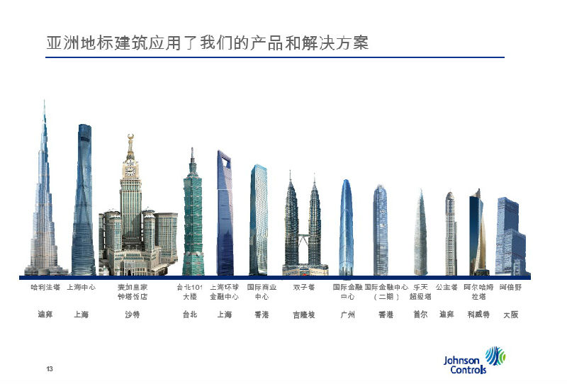 江森自控智慧建筑科技與解決方案業(yè)務(wù)在中國大陸地區(qū)擁有逾5000名員工,39個辦事處,近1000家合作伙伴,3個制造基地(2個在無錫,1個在廣州)以及1個位于無錫的亞洲技術(shù)研發(fā)中心。隨著亞洲市場需求的日益增長,江森自控宣布將第二個全球總部落戶上海。該總部計劃將于2017年完工并正式投入使用,此舉凸顯了江森自控對于中國市場的重視及承諾。江森自控智慧建筑科技與解決方案業(yè)務(wù)為綜合樓宇提供服務(wù),包括上海世博會建筑、上海環(huán)球金融中心和北京國家體育場(鳥巢)等。我們采用全面的生命周期管理方法,有效管理建筑物內(nèi)部運營及其技術(shù),涵蓋了規(guī)劃與設(shè)計、安裝與整合、優(yōu)化與維護等。我們提供以下專業(yè)的服務(wù):