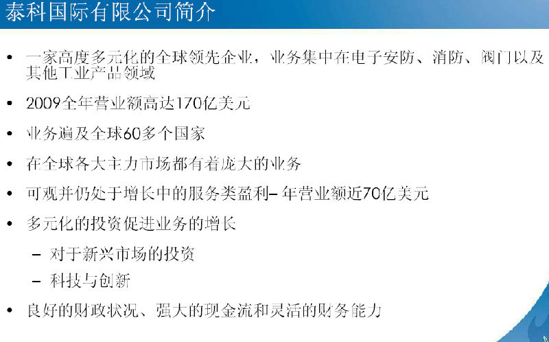 為了更好地服務(wù)中國(guó)市場(chǎng),泰科于2014年完成了對(duì)上海金盾消防安全科技有限公司的股權(quán)收購(gòu),金盾公司在中國(guó)國(guó)內(nèi)噴淋和氣體滅火產(chǎn)品線上的優(yōu)勢(shì),將幫助泰科更好地為客戶提供定制化的產(chǎn)品和方案。
