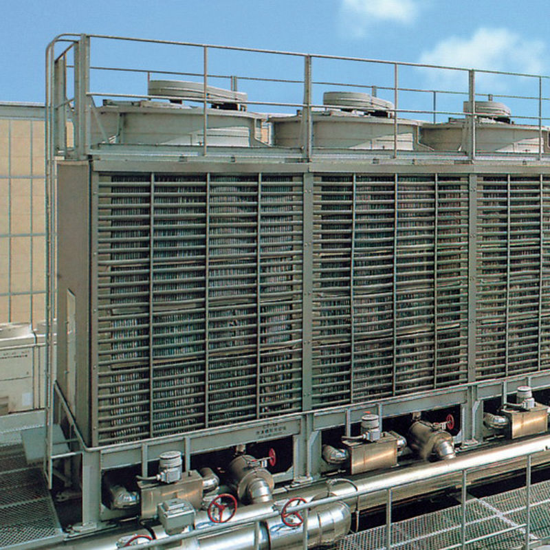 閉式冷卻塔(也叫蒸發(fā)式空冷器或密閉式冷卻塔)是將管式換熱器置于塔內(nèi),通過(guò)流通的空氣、噴淋水與循環(huán)水的熱交換保證降溫效果。由于是閉式循環(huán),其能夠保證水質(zhì)不受污染,很好的保護(hù)了主設(shè)備的高效運(yùn)行,提高了使用壽命。外界氣溫較低時(shí),可以停掉噴淋水系統(tǒng),起到節(jié)水效果。推著國(guó)家節(jié)能減排政策的實(shí)施和水資源的日益匱乏,近幾年密閉式冷卻塔在鋼鐵冶金、電力電子、機(jī)械加工、空調(diào)系統(tǒng)等行業(yè)得到了廣泛的應(yīng)用。