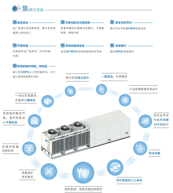 煜柯一體化集成冷凍站從前期設計到后期研發集成,均以成熟的國內外先進應用經驗為依托,所有集成冷凍站的組件均采用模塊化設計,施工簡單,迅速便捷。作為新一代的冷水機房,煜柯一體化冷水機組整機均在國內生產,集成了煜柯的多年經驗與當下先進的節能理念與卓越的生產工藝、高效的系統設計、以及精益的控制技術,為建筑提供高技術含量、技術領先、節能環保類的冷源,共筑綠色全球夢。