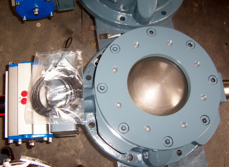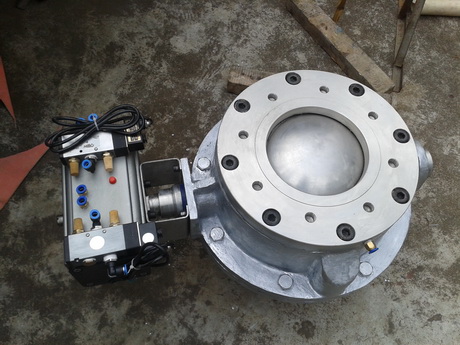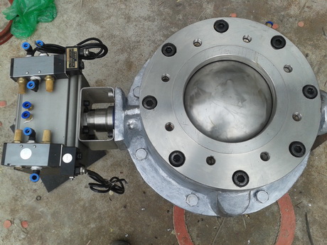 氣缸采用緊湊型的轉動輸出式的,氣缸滿足球體切割物料進行關閉和打開的轉矩需要。