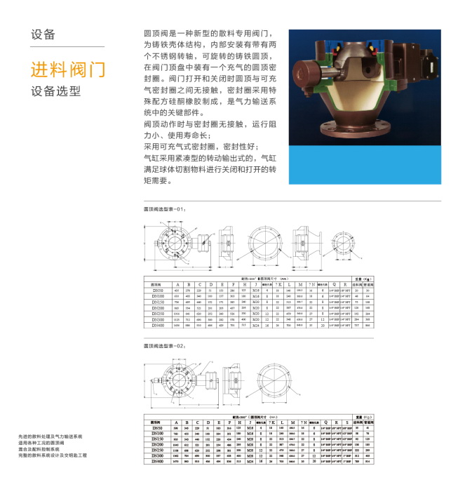 圓頂閥是一種新型的散料專用閥門,為鑄鐵殼體結構,內部安裝有帶有兩個不銹鋼轉軸,可旋轉的鑄鐵圓頂,在閥門頂盤中裝有一個充氣的圓頂密封圈。閥門打開和關閉時圓頂與可充氣密封圈之間無接觸,密封圈采用特殊配方硅酮橡膠制成,是氣力輸送系統中的關鍵部件。